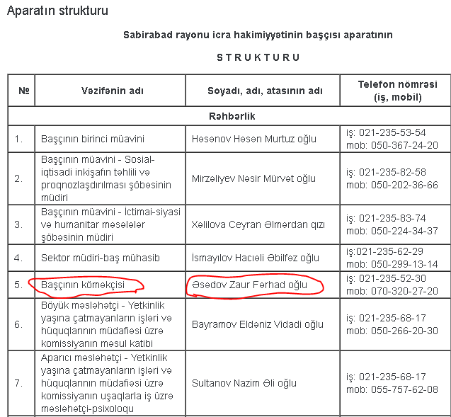 İcra Hakimiyyətinin rəsmi saytında adı başçının köməkçisi kimi qeyd olunan Zaur Əsədov isə bildirib ki, o, bu vəzifədən çoxdan çıxıb. Maraqlıdır ki, adı hələ də İcra Hakimiyyətinin rəsmi saytında qalır.