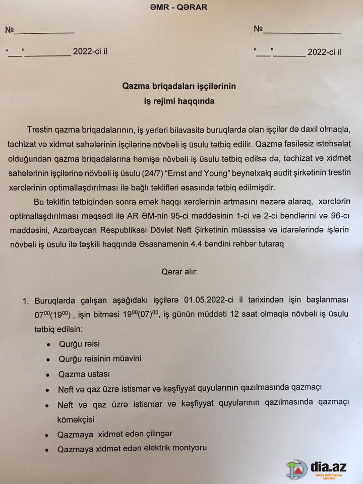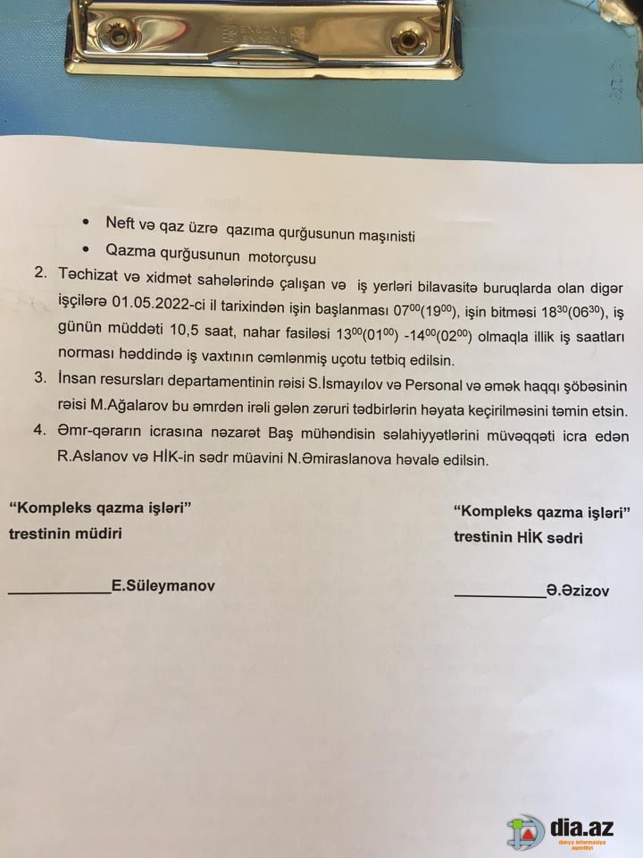 "Trest rəisinin, trestin Həmkarlar Təşkilatı ilə birlikdə tərtib etdiyi "Qazma briqadaları işçilərinin iş rejimi" adlı həmin Əmr-Qərarda (əlavə olunur) Azərbaycan Əmək Məcəlləsinin : 1. 103-cü maddəsinin tələbləri pozulub. Belə ki, 12 saatlıq iş rejimində işləyən işçilərə bu maddədə nəzərdə tutulan qaydada nahar və istirahət vaxtı verilmir. 2. 59-cu maddəsinin tələbləri pozulub. Əgər işçinin iş və istirahət vaxtı dəyişirsə, bu əvvəlcə işçilərlə razılaşdırılmalıdır, Əmək müqaviləsində müvafiq dəyişiklik edilməli, həm işçi, həm də işəgötürən imzaladıqdan sonra bu barədə Əmr verilə bilər. 3.16-cı maddənin tələbi 2 halda pozulub: 3.1. eyni sahədə 12 saatlıq iş rejimində işləyən işçilərə nahar və istirahət vaxtı verilmir, onlardan daha az işləyən, 11.5 saat işləyən işçilərə 1 saat verilir. 3.2. eyni sahədə cəmlənmiş iş vaxtında işləyən işçilərdən bir qrupuna nahar fasiləsi vermədən 12 saatlıq, digər qrupuna isə 10.5 saatlıq və 1 saat nahar fasiləsi ilə 11.5 saatlıq iş rejimi tədbiq edilir, yəni işçilər arasında ayrı seçkilik qoyulur. Əmək qanunvericiliyinin müvafiq maddələrinə zidd olan bu əmrə həm də HT sədri Ə.Əzizov qol çəkib".
