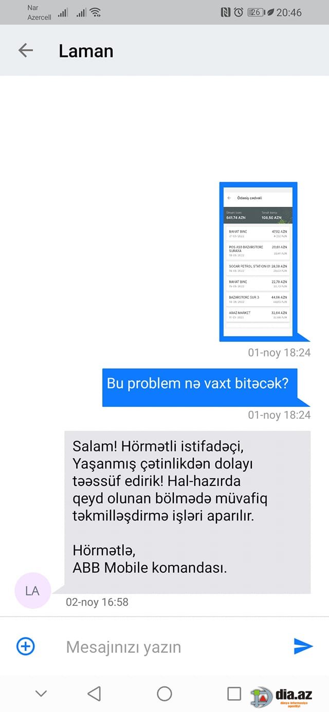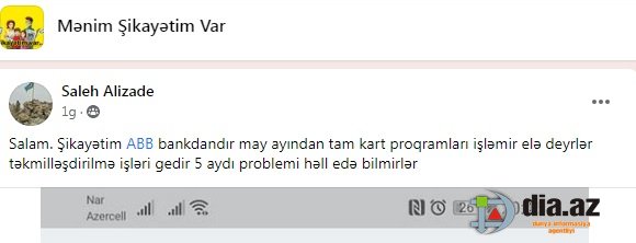 "Şikayətim "ABB bank"dandır". DİA.AZ bildirir ki, bunu "Mənim Şikayətim Var" sosial qrupundakı paylaşımında Saleh Əlizadə adlı istifadəçi gileyində qeyd edir.