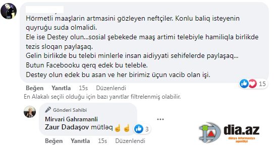 DİA.AZ bildirir ki, M.Qəhrəmanlının çatdırdığı bu çağırış digər neftçilər tərəfindən də dəstəklənib: