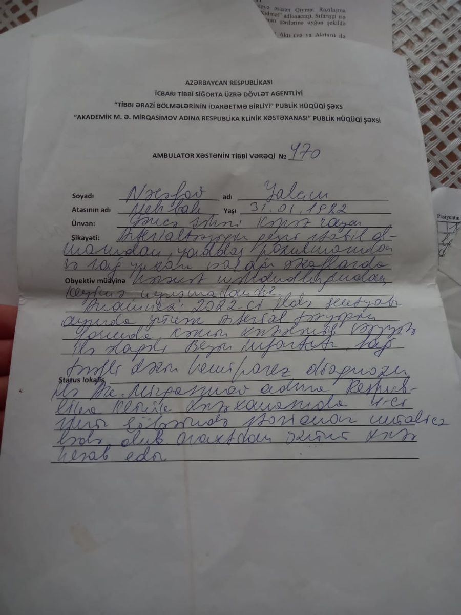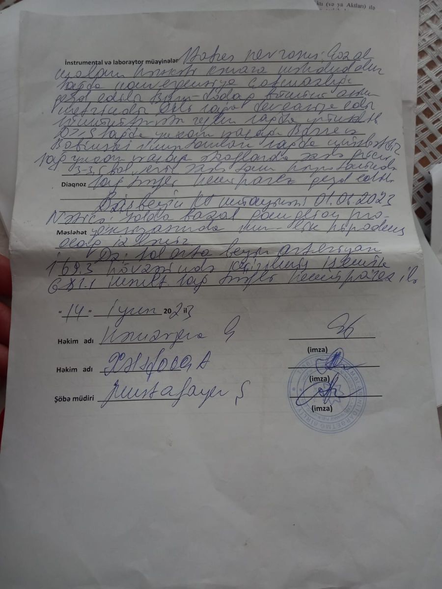 Əmək və Əhalinin Sosial Müdafiəsi Nazirliyi isə xəstəliyimi tanımayıb, mənə imtina sənədini göndərir. Həkim sənədlərdə də təsdiq edir ki, mən ağır xəstəyəm.