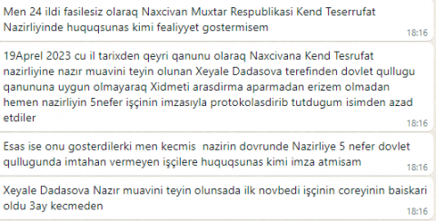 Naxçıvanın Kənd Təsərrüfatı naziri əvəzi Bakıda bir kolleci bitirib və nazir təyin olunandan sonra hansısa universitetin hüquq fakültəsinə daxil olub. Yəni nazir xanım əfəndi faktiki olaraq tələbədir və bu vaxta qədər Qida Təhlükəsizliyi Agentliyində işləyib.