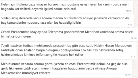 Şikayətçi məhkəmənin bu qərarı ilə razılaşmaq istəmir. O, bütün məhkəmə intansiyalarına və ölkə başçısına müraciət etmək niyyətindədir. Dediyinə görə, artıq Birinci Vitse-Prezident Mehriban xanım Əliyevaya məktub göndərib. Amma indiyədək bu məktubun da cavabı gəlməyib. Gülşən xanım inanır ki, məktub Mehriban xanıma çatmayıb. Odur ki, ikinci məktubu Prezident İlham Əliyevə yazmaq niyyətindədir və ümidvardır ki, ölkə rəhbərinə yazacağı məktub yolda itib-batmayacaq. Hüququnu bu yolla təmin edə bilməsə, beynəlxalq məhkəməyə də üz tuta bilər.