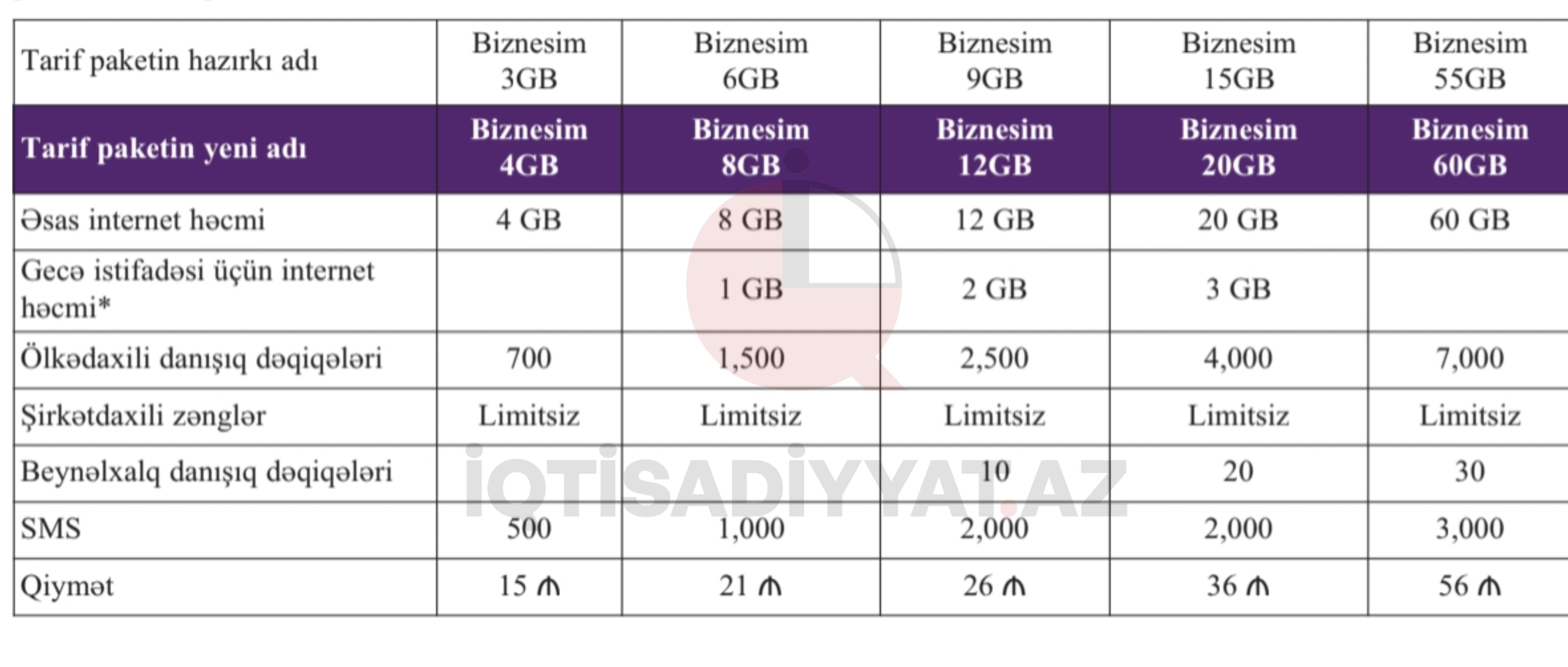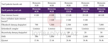Belə ki, fevralın 25-dən sonra “Biznesim 3GB” tarifi “Biznesim 4GB”, “Biznesim 6GB” tarifi “Biznesim 8GB”, “Biznesim 9GB” tarifi "Biznesim 12GB”, “Biznesim 15GB” tarifi "Biznesim 20GB” və “Biznesim 55GB” tarifi "Biznesim 60GB” adlanacaq.