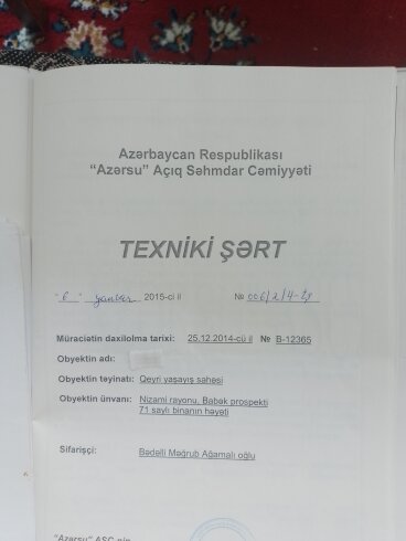Su, kanalizasiya rüşvətinə, korrupsiyasına baxın, “Azərsu” 11 il qabaq (06.01.2015-ci il tarixıi) texniki şərt verib və obyektin altından SU, KANALİZASİYA XƏTTİNİN KEÇMƏDİYİNİ təsdiq edib. (Keçsə idi, texniki şərt verilməzdi ). ADSEA İri Şəhərlərin Birləşmiş Su Təchizatı Xidməti (PHŞ-nın idarə heyətinin sədr müavini Cabbar Cabbarlı) isə 04.08.2025-ci il tarixli məktubla bildirib ki, obyekt kanalizasiya xəttinin mühafizə zonasında olduğundan 1-ci dərəcəli Qarabağ qazisinin vəsaiti hasabına köçürüləcəyi halda müraciətə yenidən baxıla bilər.(?)