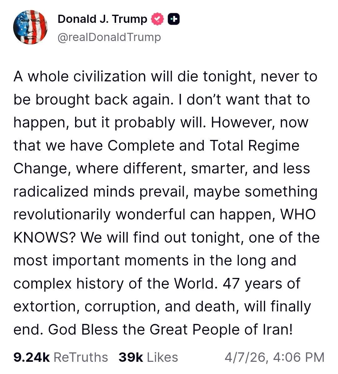 O daha sonra fikrini belə davam etdirir: "Kiminsə bunu nəinki etməyə, hədə kimi dilinə gətirməyə də haqqı yoxdur. Dünyanın ən böyük Respublikasının başında duran şəxs bir birini sevməyən ruhani rejimlər arasında tələyə ilişmiş adam kimi danışmamalı və hərəkət etməməlidir..."