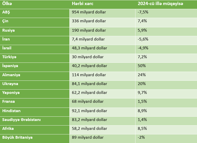 Qeyd edilib ki, ABŞ, Çin və Rusiya ümumilikdə 1,48 trilyon dollar və ya qlobal hərbi xərclərin 51%-ni xərcləyiblər.