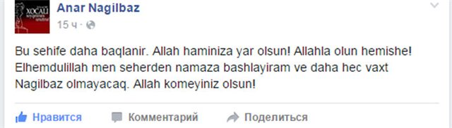 "Bu səhifə daha bağlanır. Allah hamınıza yar olsun! Allahla olun həmişə! Əlhəmdulillah, mən səhərdən namaza başlayıram və daha heç vaxt Nağılbaz olmayacaq. Allah köməyiniz olsun!" - yazaraq hər kəslə vidalaşıb.