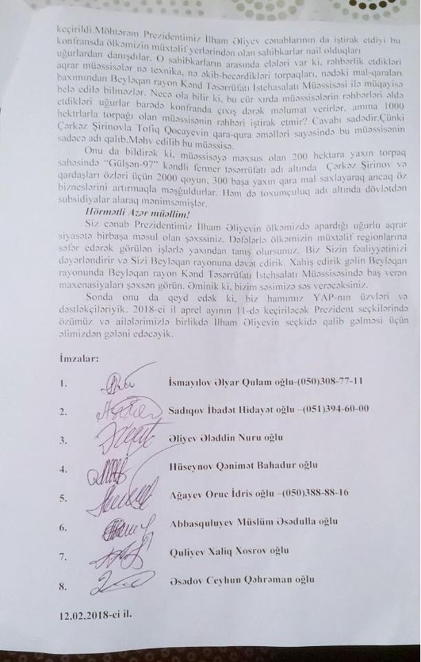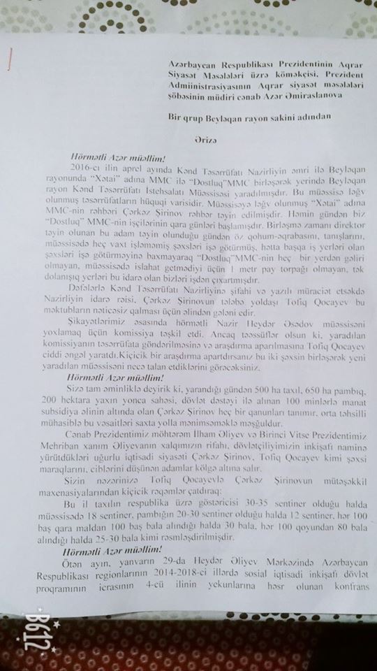 Saytımızın ötən sayında (http://qlobal.az/nazirliyin-sbe-mudiri-ile-muessise-direktoru-korrupsiyada-ittiham-olunur-vitse-prezidente-sensasion-sikayet/#.WoHbcyXFLIU) Birinci vitse-prezident Mehriban xanım Əliyevaya müraciət edən Beyləqan rayon sakinləri ölkənin ən böyük aqrar müəssisələrindən biri olan Beyləqan rayon Kənd Təsərrüfatı İstehsalı Müəssisəsində baş verən korrupsiya hallarından şikayət edirdilər. Qlobal.az-a ünvanladıqları bu dəfəki məktubda isə şikayətçilər yaranmış acınacaqlı durumla yerində tanış olmaq və lazımi hüquqi ölçü götürülməsi üçün Azərbaycan Prezidentinin Aqrar siyasət məsələləri üzrə köməkçisi-şöbə müdiri Azər Əmiraslanovu Beyləqan rayonuna, Beyləqan rayon Kənd Təsərrüfatı İstehsalı Müəssisəsinə dəvət edirlər.
