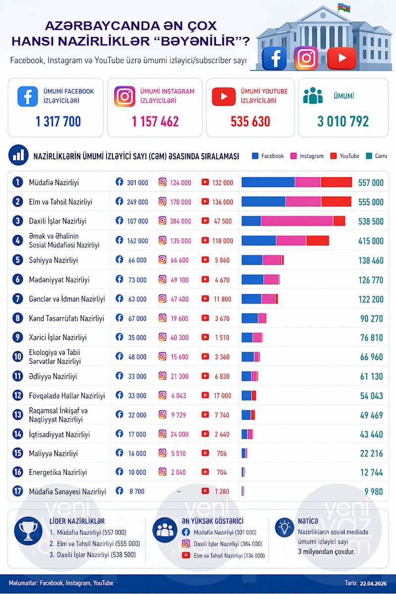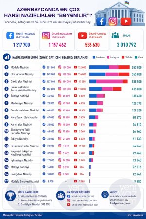 Azərbaycanda nazirliklərin 3 aparıcı sosial şəbəkədəki rəsmi hesabları üzrə ümumi izləyici sayı 3 010 792 təşkil edir.