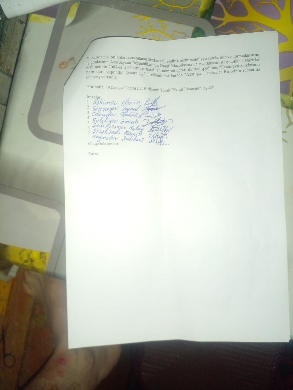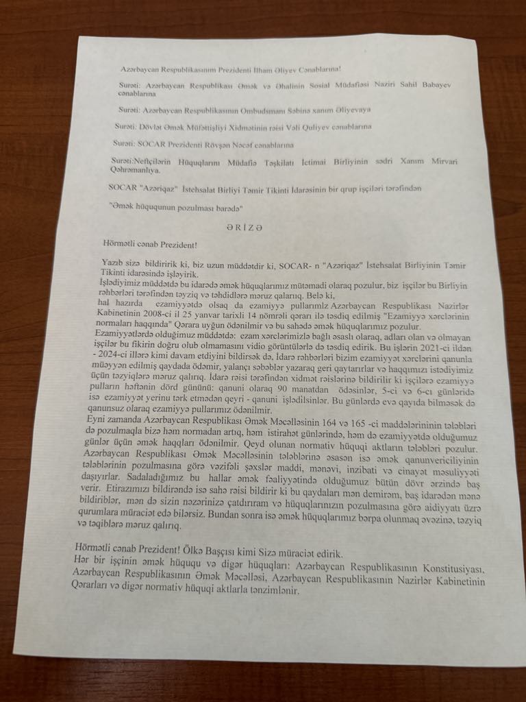 "Bildiyiniz kimi, ötən həftə "Azəriqaz" İstehsalat Birliyinin Təmir Tikinti İdarəsinin 1,2,3 saylı təmir tikinti quraşdırma sahəsinin işçiləri əmək hüquqlarının pozulması ilə əlaqədar ölkə başçısına, müvafiq dövlət qurumlarına və təşkilatımıza (NHMT nəzərdə tutulur -diaaz.space) ərizə ilə müraciət ediblər". diaaz.space xəbər verir ki, bunu öz açıqlamasında Neftçilərin Hüquqlarının Müdafiəsi Təşkilatının (NHMT) sədri Mirvari Qəhrəmanlı qeyd edib.