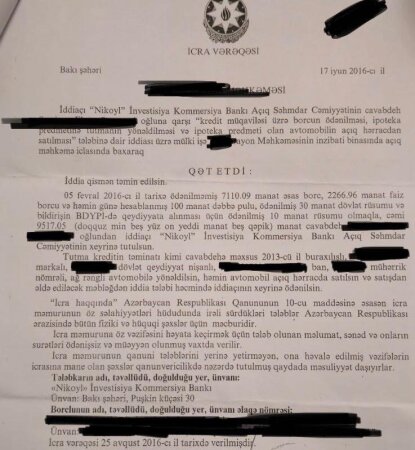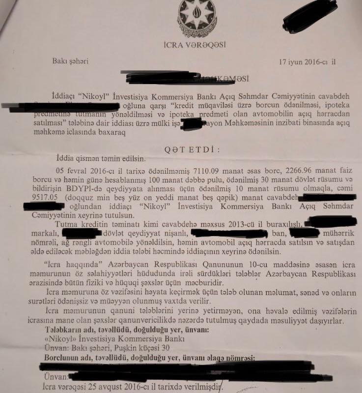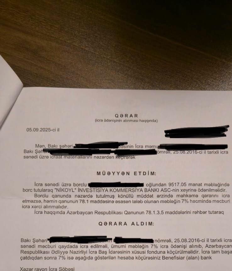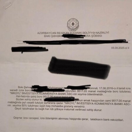 12 ildən sonra məhkəmədən icra sənədi gəldi və bildirildi ki, maaşımdan 50% kreditin pulu tutulacaq...