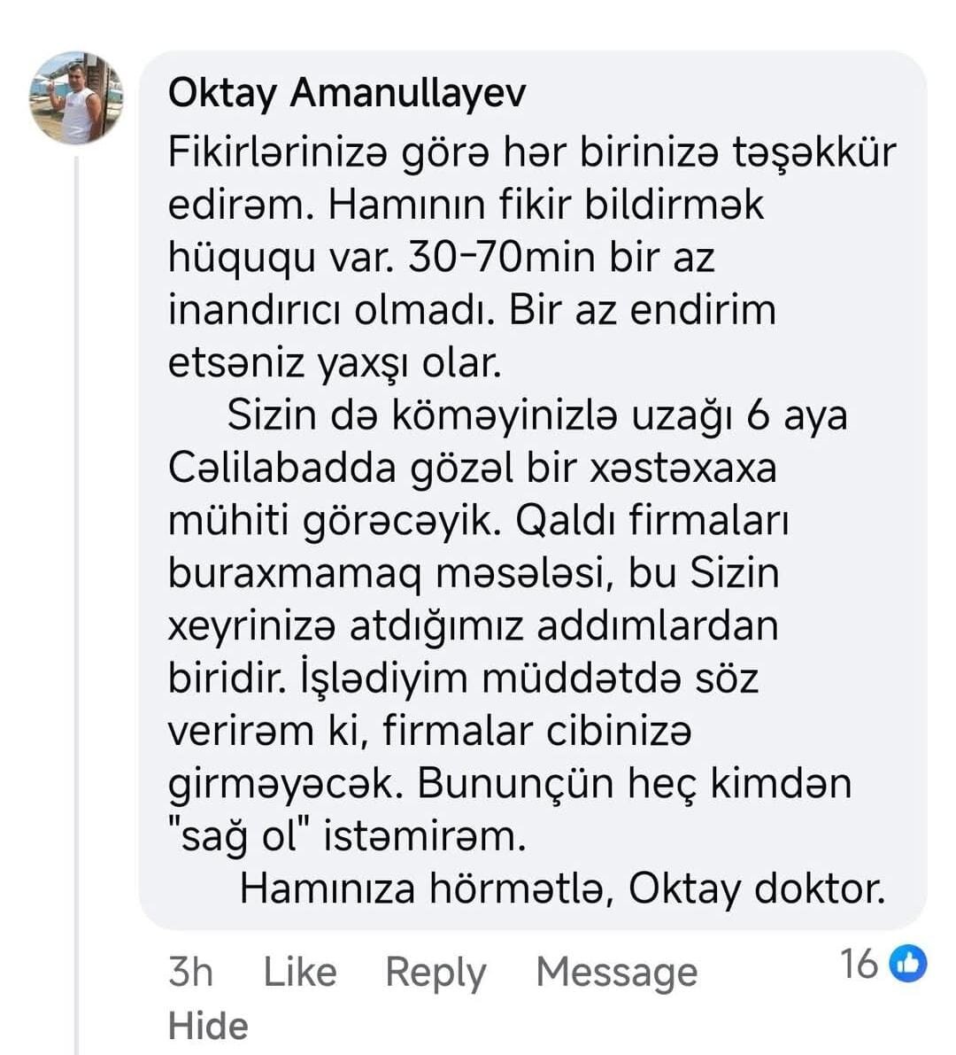 Hamınıza hörmətlə, Oktay doktor”, – deyə O.Əmənullayev qeyd edib.