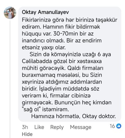 Sizin də köməyinizlə uzağı 6 aya Cəlilabadda gözəl bir xəstəxana mühiti görəcəyik. Qaldı firmaları buraxmamaq məsələsinə, bu sizin xeyrinizə atdığımız addımlardan biridir. İşlədiyim müddətdə söz verirəm ki, firmalar cibinizə girməyəcək. Bunun üçün heç kimdən “sağ ol” istəmirəm.