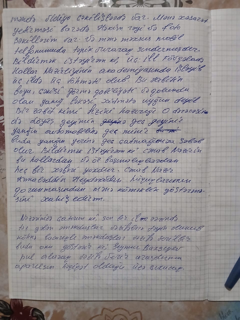 Yeri gəlmişkən qeyd edim ki, Fövqəladə Hallar Nazirliyinin Akademiyasında üç il işlədiyi müddətdə üç dəfə töhmət alan Huseynağa Hüseynzadənin fiziki durumu yanğın xidmətinə uyğun deyil. Nazir Kəmaləddin Heydərovun baş verənlərdən xəbər yoxdur. İnanıram ki, cənab nazirin xəbəri olsa, Lənkərandakı bu qurumda yoxlamalar apartdırıb, konkret Seymur və Sənan barədə ciddi tədbir görəcək. Buna görə, yalnız nazirdən kömək almağa ümidliyəm.