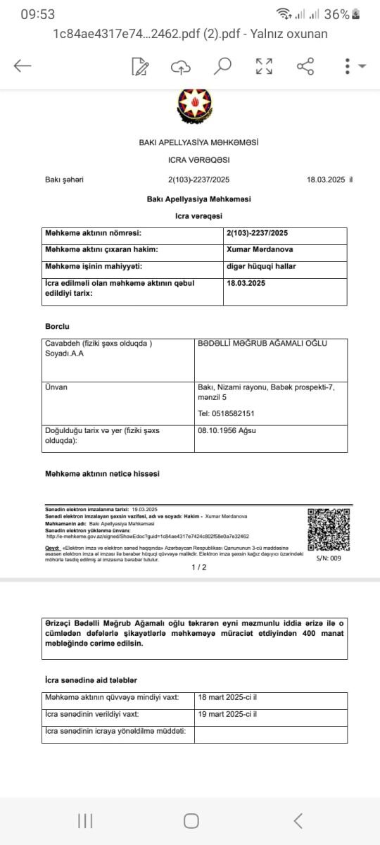 15.10. 2025-ci ildə 4047171 stasionarnömrəsindən zəng edən Ədliyyə Nazirliyinin İcra xidmətinin əməkdaşı “elektron icra” sistemində tələbkar 1-ci dərəcəli Qarabağ əlilinin xeyrinə borclu “Azərsığorta”ya qarşı 2 işdən özgə heç bir icra işinin olmadığını, əleyhinə isə Nərimanovda 2 cərimə işinin olduğunu bildirib. Bəs Nizami və Xətai icra şöbələrinin 17-ci ildir icra etməkdən imtina etdiyi Xətai məhkəməsinin 26.05.2009-cu il tarixli 2(011)-451/09 və 21.06.2011-ci il tarixli 2(011)-855/11 saylı 2 qətnaməsi necə ? Axı borclular ƏMDX, Nizami RİH (MKTB) ƏN-in icra şöbələrini də rüşvətlə susdurmaqla qazi-tələbkara sahibkarlıqla məşğul olmağa məhkəmənin ayırdığı Nizami rayonu, Bəhruz Nuriyev-10a ünvanındakı qeyri-yaşayış otaqlarını öncə həmin ünvandakı bankın, bank məhkəmə qorxusundan bunu yalanlayanda 9 yaşlı rayon sakini olmayan (?) Hüseynov Aydın Bəxtiyar oğlunun, 2021-ci ildə ata adı olmayan (?) Türkiyə vətəndaşı Kerem Sezerin adına sənədləşdiriblər. Axı tələbkar 1-ci dərəcəli Qarabağ əlili icranı tələb etdiyinə görə icra məmurlarının sifarişilə evindən polislə oğurlanıb, 2 sutka işgəncə kamerasında saxlanılıb. Hətta 2011-ci il tarixli icra sənədini qətnamə ilə birlikdə 3 il sonra-2014-cü ildə tələbkara göndərən hakim Raziya Ataşovanı icra məmurları müstəntiq Qalib Kərimlinin göstərişi ilə işgəncə kamerasına gətirib tələbkar 1-ci dərəcəli Qarabağ qazisinin üzünə durdurublar! Keçmiş hakim də özünün göndərdiyi məktubdan imtina edib ki, icra vərəqini göndərməyib, tələbkara icra vərəqi verilmir. (??) Bu arqumentlərə 4047171 nömrəsindən bir həftə qabaq zəng edən icra xidməti əməkdaşının cavabı “elektron icra” sistemində icra işinin olmaması” olub. Bəs bu dələduzluq deyil? Necə olur, tələbkar 17 ildir icranı tələb edir, icra işi elektron sistemə qoyulmur, amma saxta məhkəmələrin öz xeyrinə çıxardığı dələduzluq işləri gecə ilə sistemdə yerləşdirilir? Budur hamının qanun və məhkəmə qarşısında bərabərliyi prinsipi?