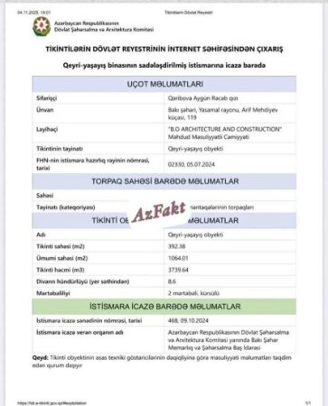 Aygün Qəribovanın Arif Mehdiyev 119 ünvanında olan obyektinin ümumi sahəsi 500 kvadrat metrə yaxındır.