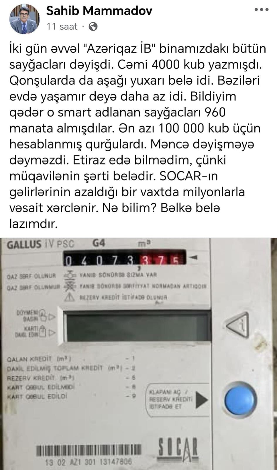 “İki gün əvvəl “Azəriqaz” İB binamızdakı bütün sayğacları dəyişdi. Cəmi 4000 kub yazmışdı. Qonşularda da aşağı yuxarı belə idi. Bəziləri evdə yaşamır deyə daha az idi.