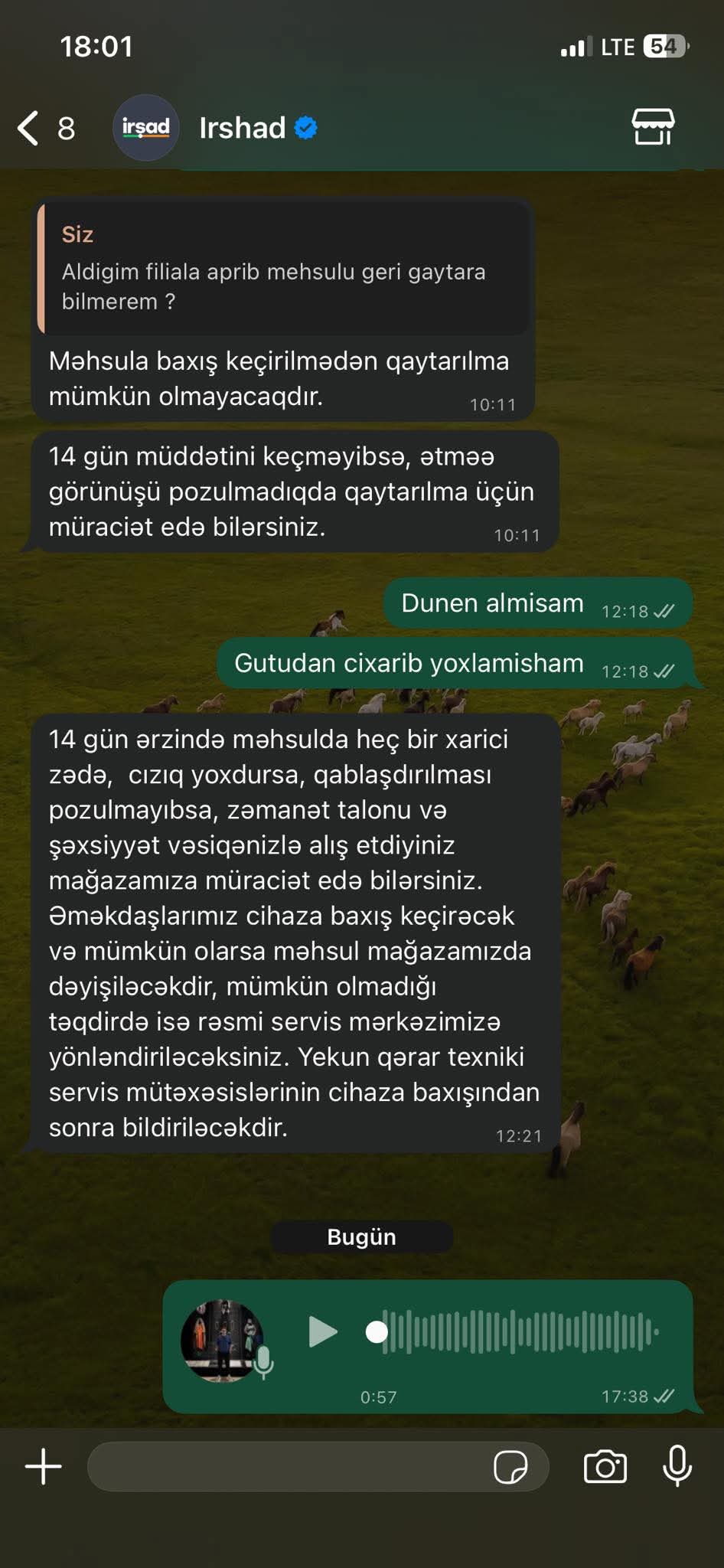 WhatsApp-da operatorları deyir: “14 gün ərzində dəyişdirib qaytara bilərsiniz. Əgər qablamaqda problem yoxdursa, məhsulda cızıq, zədə yoxdursa.” Hər şeyin qaydasında olduğunu, lakin köməklik göstərmək üçün müdir olmadan kömək edə bilməyəcəklərini dedilər.