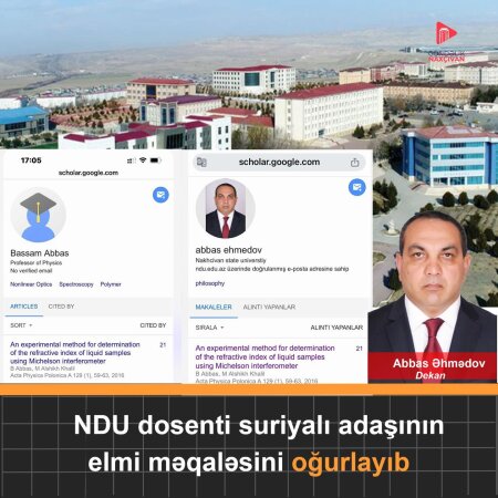 Naxçıvan Dövlət Universitetinin dosenti Abbas Əhmədov suriyalı alim B. Abbasın fizika sahəsindəki elmi araşdırmasını adına çıxıb, özünü “Google Scholar” elmi səhifəsində paylaşıb. “Google Scholar” elmi işlərin beynəlxalq şəkildə izlənildiyi platformadır və burada başqasına aid araşdırmanın müəllif məlumatlarını dəyişdirmədən öz hesabına əlavə edilməsi ciddi etik pozuntusu sayılır.