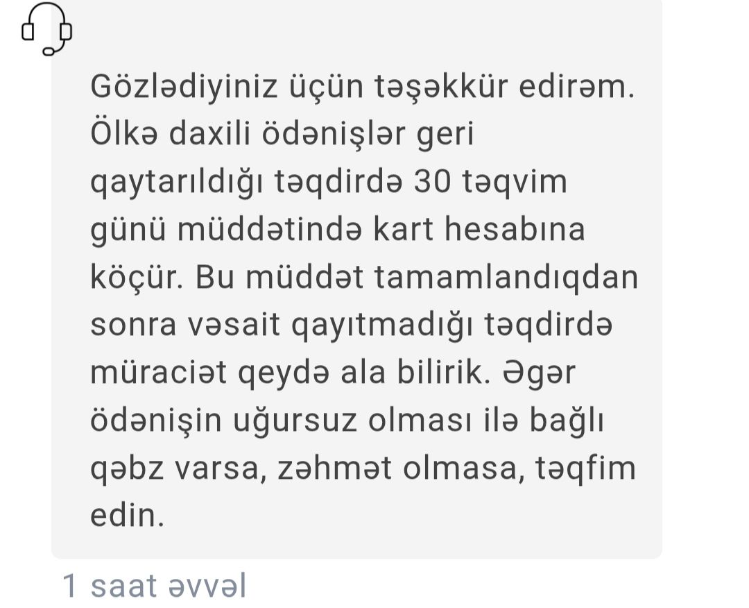 1 həftədir ödəniş geri qaytarılmır. Əgər 30-cu təqvim günündə ödəniş geri qayıdacaqsa, alıcı nağd ödənişlə etməyə üstünlük verəcək. Bu birmənalı olaraq nağdsız ödənişdən yayındırmaqdır..."