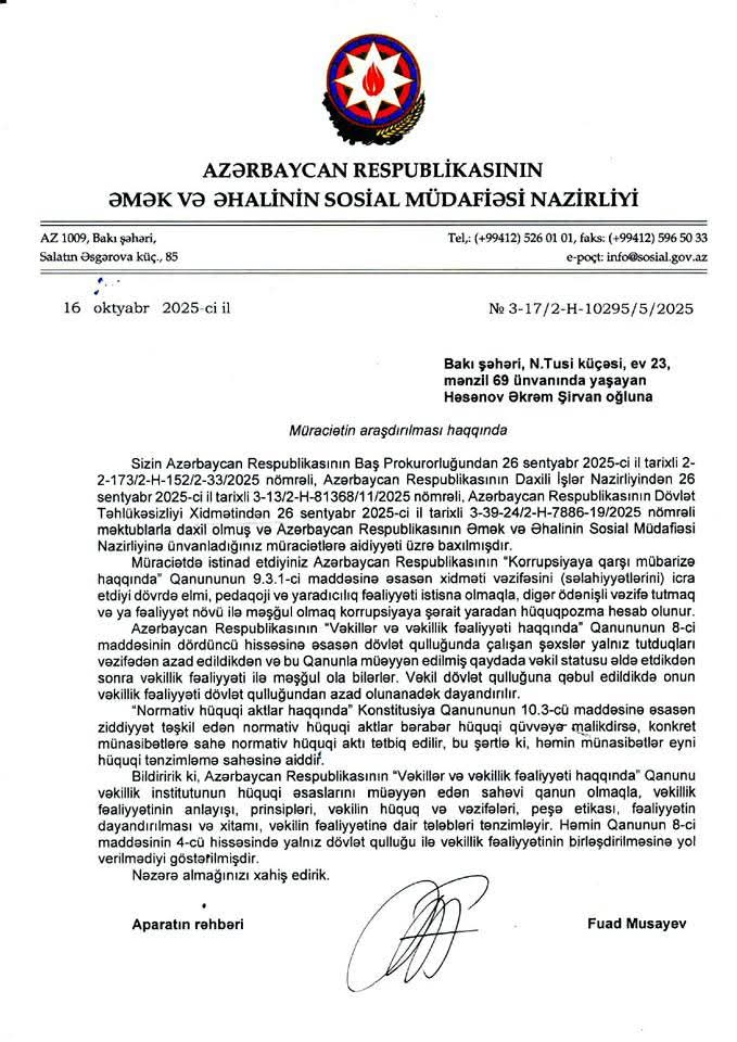 Məsələ ilə əlaqədar təkrar olaraq Baş Prokurora müraciət etmişəm. Məsələ ciddi nəzarətə götürülməlidir. Belə çıxır ki, publik hüquqi şəxslərdə vəzifəli şəxslərin hər hansı digər ödənişli fəaliyyətinə heç bir məhdudiyyət yoxdur. Çünki Əmək və Əhalinin Sosial Müdafiəsi Nazirliyi işində “Korrupsiyaya qarşı mübarizə haqqında” Qanunu rəhbər tutmur..."