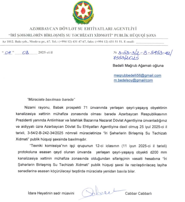 4. ADSEA-nın 25.08.2025-ci tarixli obyektin su və kanalizasiya xəttinin üstündə tikilməsi haqqında saxta rəyi;