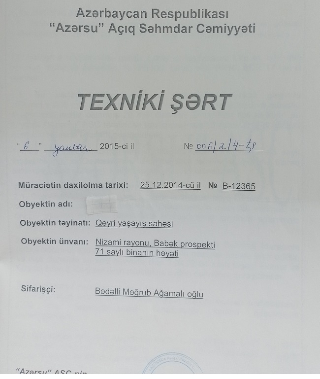 “Prezidentin 14.06.2023 tarixli, 2181 nömrəli fərmanının icrasına ADSEA və "Azəriqaz" dələduzluqla, rüşvət almaq amacı ilə 10 aydır qadağa qoyub. ADSEA 10 il qabaq "Azərsu"nun verdiyi 06.01.2015-ci il tarixli texniki şərt əsasında sayğac quraşdırılan qeyri-yaşayış binasının altından 2025-ci ildə kanalizasiya xəttinin keçdiyinə dair saxta rəy verib(06.01.2015-ci il tarixli texniki şərtin obyektin altından su və kanalizasiya xətti keçmədiyini təsdiq edən sxemi və ADSEA-nın 2025-ci il tarixli obyektin kanalizasiya xəttinin üstündə tikilməsi barədə saxta rəyi əlavə olunur). FHN TTNDA isə saxtalıq tam ortada olmağına baxmayaraq, bu cinayətə qiymət vermir. Elə polis, prokurorluq, təhlükəsizliyə cavabdeh qurumlar da. Qaz xətti isə obyektin çölündən keçdiyi halda mənfi rəy verilib ki, olmayan pilləkən qəfəsinin içindən keçir (əlavə olunur). FHN TTNDA da məndən ADSEA-ya və "Azəriqaz"a müraciət etməyi tələb edir. Niyə? Bəs TTNDA nə işinə baxır? Prezident 2181 nömrəli fərmanı ilə bunu FHN-ə tapşırıb.