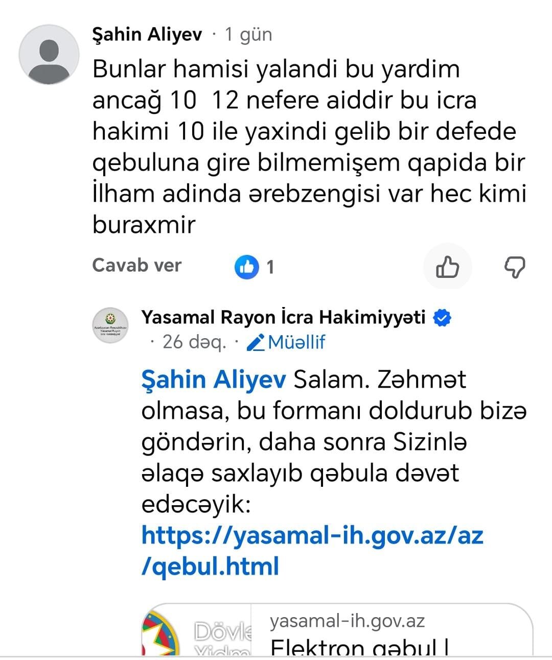 Yasamal rayon İcra Hakimiyyətinin də şikayətçi vətəndaşa cavabı gecikməyib. Rəsmi səhifə şikayətçiyə elektron formada qəbula düşməyi məsləhət görüb.