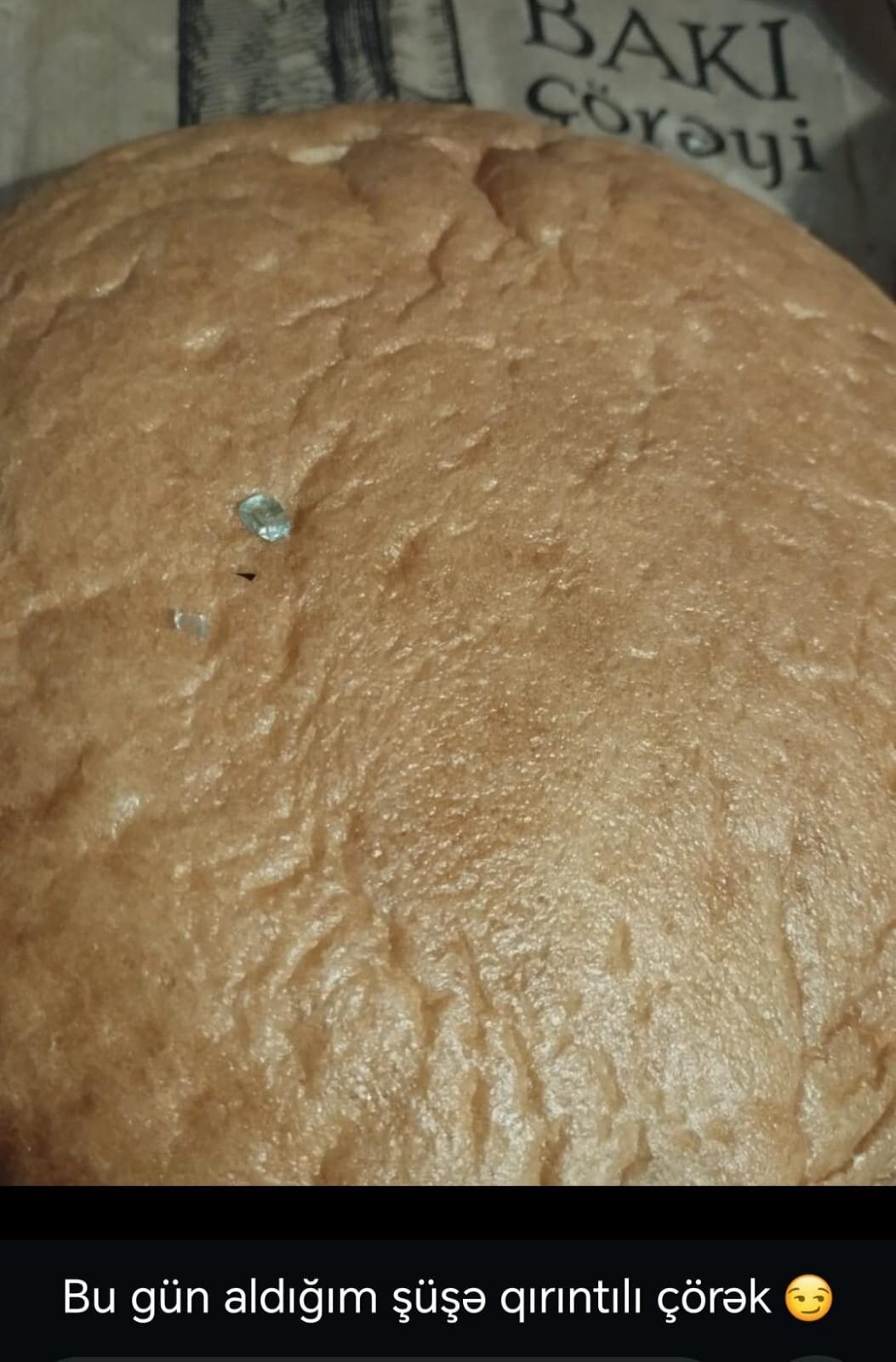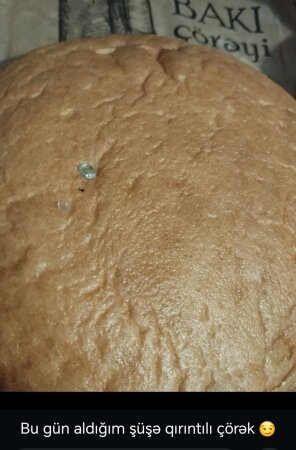 Tribuna.az xəbər verir ki, bu barədə sözügedən çörəkdən alan İlahə adlı xanım sosial şəbəkədə paylaşım edib. O bildirib ki, çörəyin üstündə şüşə qırıntısı olub: