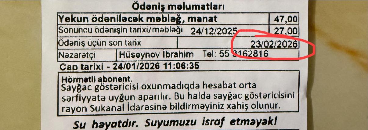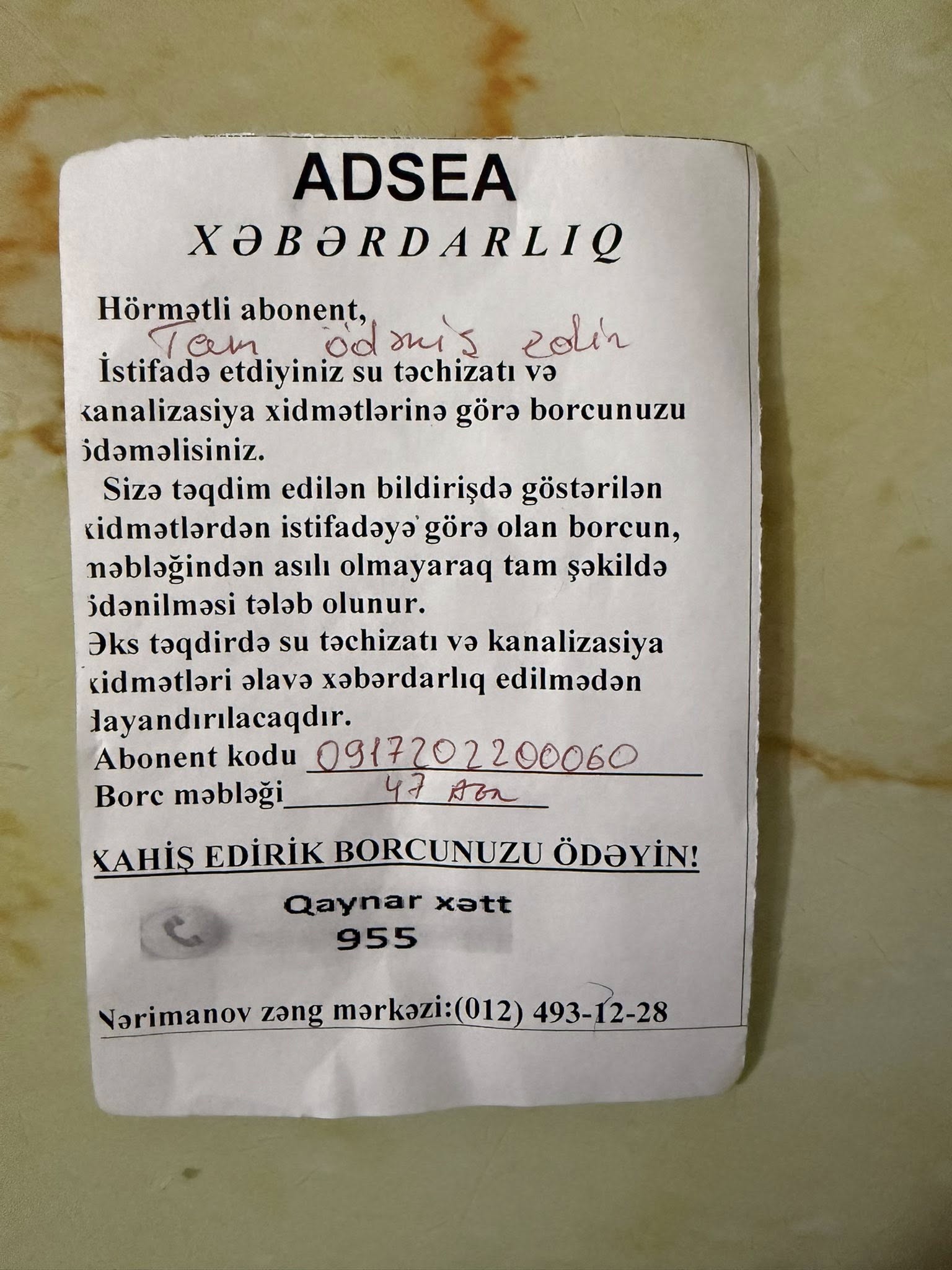 Buna baxmayaraq, 26.01.2026 tarixində evə qayıdarkən qapıda xəbərdarlıq olduğu və evə daxil olduqda suyun kəsildiyi məlum olub. Bildirirəm ki: