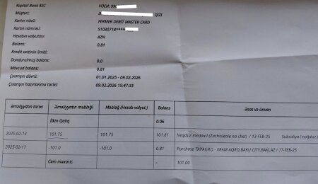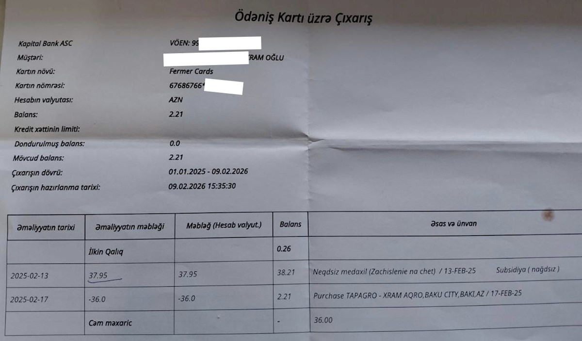 Redaksiyamıza təqdim olunan bank çıxarışlarında aydın görünür ki, fermerlərin kartına “subsidiya” adı ilə köçən vəsaitlər (məsələn, 37.95 AZN və 101.75 AZN kimi məbləğlər) bir neçə gün sonra “TAPAGRO-XRAM AGRO” şirkəti tərəfindən “satınalma” əməliyyatı ilə silinib. Atanın iddiasına görə, bu, kütləvi xarakter daşıyır və minlərlə fermerin kartı bu üsulla boşaldılıb.