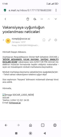 Amma SOCAR/Azəriqaz mənim vakansiya müraciətimi formal şəkildə rədd etdi — səbəb: “təhsil uyğun deyil”. Mənim ixtisasım, təcrübəm və indiki vəzifəm bu tələblərə tam uyğundur!