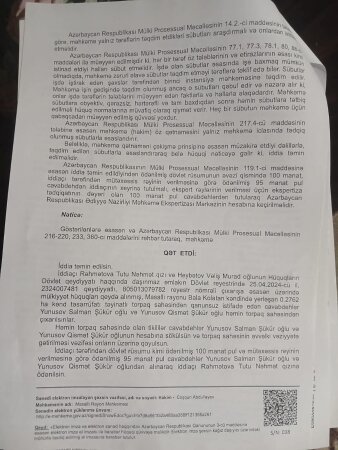 Məhkəmə qətnaməsində də yazılıb ki, həmin yer Nəhmətova Tutu Nəhmət qızına aiddir. Məhkəmə qətnaməsində ərazidəki tikililərin Yunisov Salman və Yunisov Qismət tərəfindən sökülməsi və onların oradan çıxarılması qərara alınıb. Lakin qarşı tərəf bunu etməyyərək məhkəmə qərarından apellyasiya şikayəti verib.