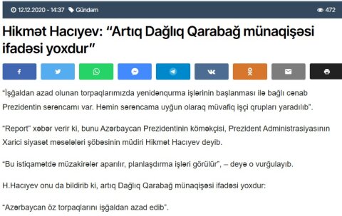 Prezidentin köməkçisi Hikmət Hacıyev də bu mövqeni təsdiqləyərək “Dağlıq Qarabağ münaqişəsi” ifadəsinin artıq mövcud olmadığını, Azərbaycanın öz torpaqlarını işğaldan azad etdiyini vurğuladı. Yəni siyasi xətt iki ayrı səviyyədə – həm dövlət başçısı, həm də onun rəsmi nümayəndəsi tərəfindən ifadə edildi. Bundan sonra hansısa dövlət qurumunun bu mövqeni görməməzliyə vurması üçün heç bir əsas qalmırdı.