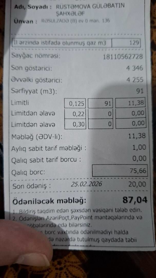 “Bu müddətdə qazdan demək olar istifadə etməmişəm. Maraqlıdır ki, sayğacın göstəricisi artmaq əvəzinə bir vahid geri gedib. İdarəyə müraciət edib qəbz tələb etdim. Mənə əvvəlcə dedilər ki, “Azəriqaz” qəbz vermir. Sonradan qəbzi ala bildim və orada da 10 gün əvvəlki göstərici 4346 kimi qeyd olunub”, – deyə o qeyd edir.