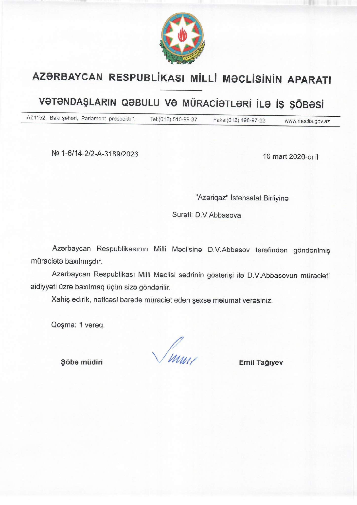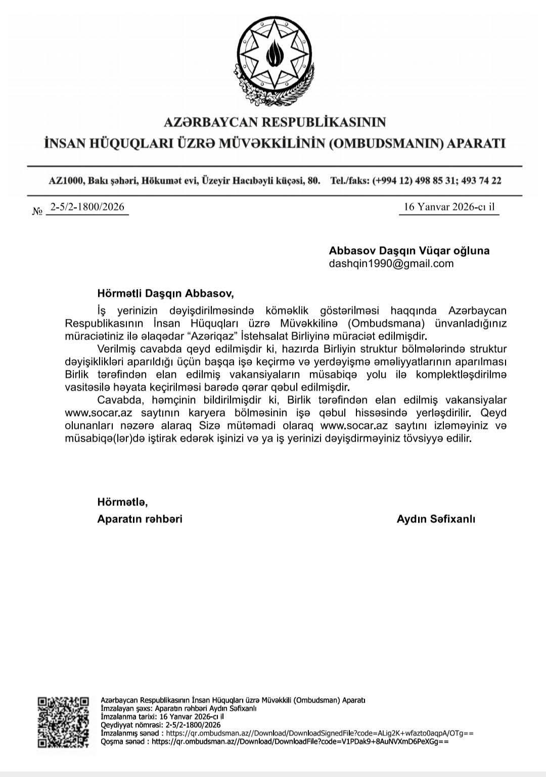 2. “Azəriqaz” İstehsalat Birliyi / SOCAR – baş direktor cənab Azər Məmmədova edilmiş müraciətlər cavablandırılıb, lakin iş yerinin dəyişdirilməsi ilə bağlı konkret həll təklif edilməyib.