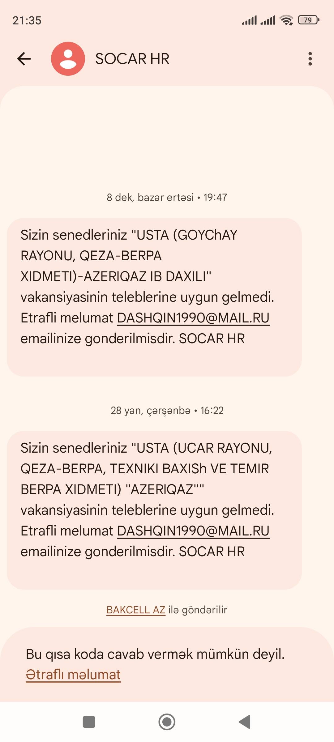Usta vəzifəsi: müraciət iş təcrübəsinin uyğun olmaması səbəbi ilə rədd edilmişdir.