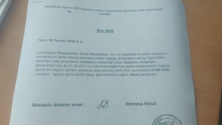 Tehsil. Media bildirir ki, məlumata görə, cari ilin yanvarın 6-da təsərrüfat müdirinin 65 yaşı tamam olub. Mövcud qanunvericiliyə uyğun olaraq, işəgötürən (məktəb rəhbərliyi) onunla yenidən əmək müqaviləsi bağlayıb. Ən maraqlı məqam isə budur ki, imzalanan həmin rəsmi sənəddə müqavilənin müddəti "müddətsiz" olaraq qeyd edilib. Lakin sonradan verilən əmrdə hansısa naməlum səbəbdən 14 iyun tarixi son müddət kimi göstərilib.