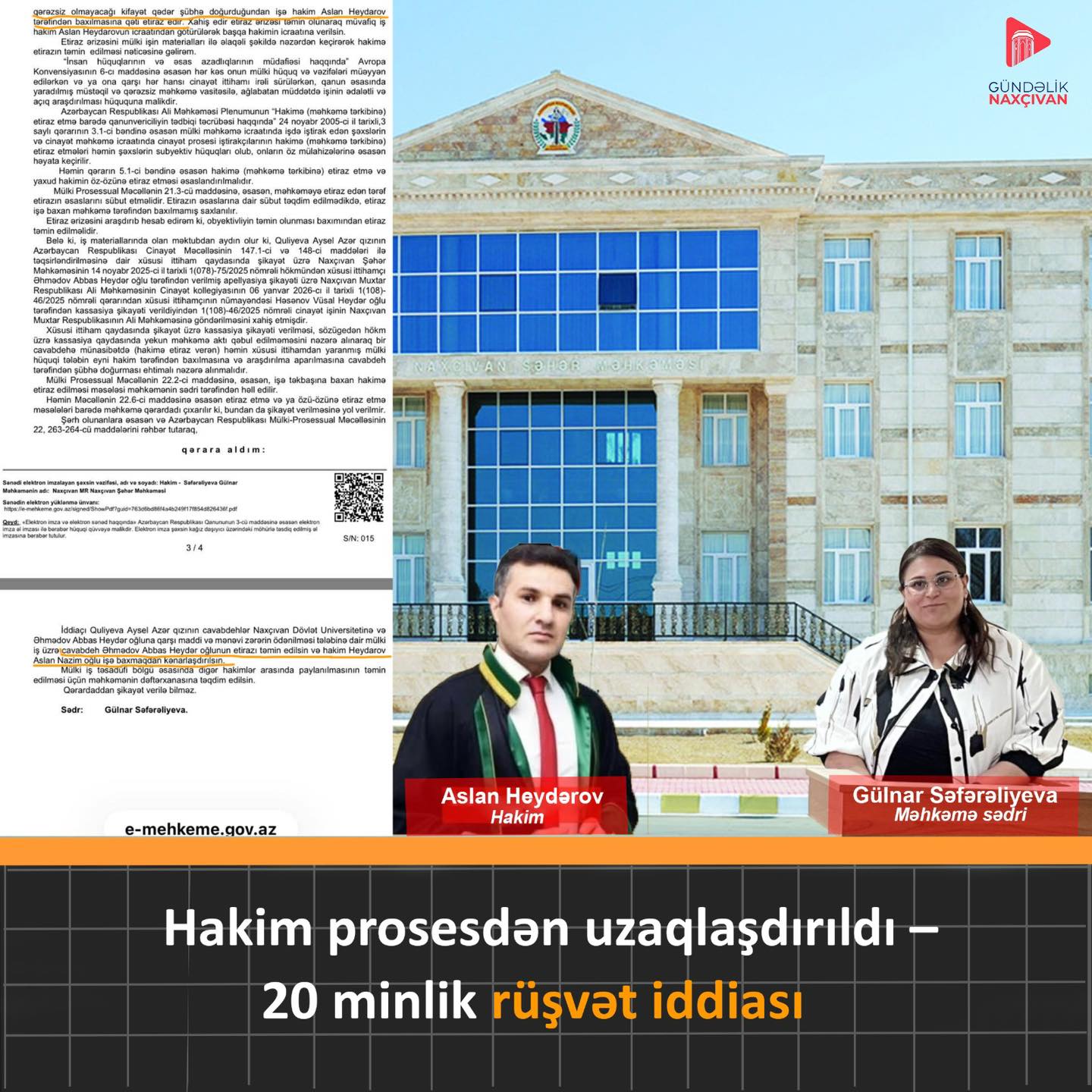 Naxçıvan şəhər Məhkəməsinin sədri Gülnar Səfərəliyeva hakim həmkarını qərəzli olmaqda ittiham edərək, prosesdən uzaqlaşdırıb.