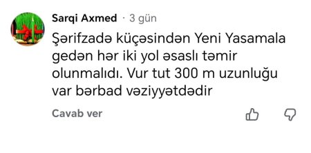 Şərifzadə küçəsindən Yeni Yasamala gedən hər iki yol əsaslı təmir olunmalıdır. 300 metr uzunluğuvar, bərbad vəziyyətdədir”.