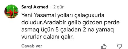 “Yeni Yasamalın yolları çala-çuxurla doludur. Arada gəlib gözdən pərdə asmaq üçün 5 çaladan 2-nə yamaq vururlar, qalanı qalır.