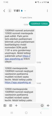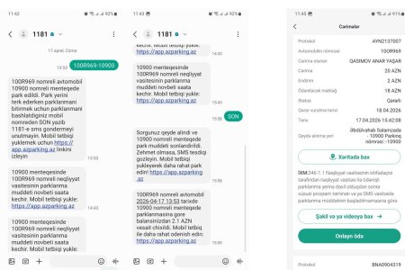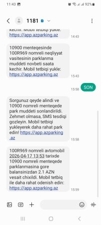 Şikayətçi təqdim etdiyi məlumatlarda 1181 nömrəsinə göndərdiyi SMS bildirişini, parklanma müddətini və xidmətin dayandırıldığı vaxtı göstərib. Bildirilir ki, sürücünün balansından 3 saatlıq parkinq üçün 2,1 manat məbləğində vəsait tutulub.