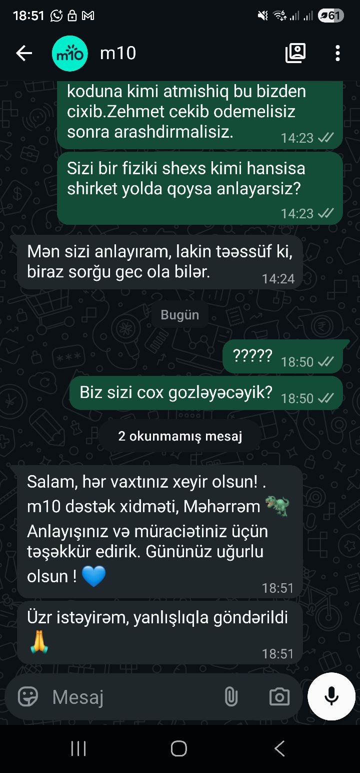 "Şəxsi vəsaiti mənimsəyiblər və günü-günə satırlar. Qrupda olan her kes bilsin ki "m10" adı altında fəaliyyət gostərən dələduzlar istənilən vaxt pulunuzu mənimsəyə bilər.