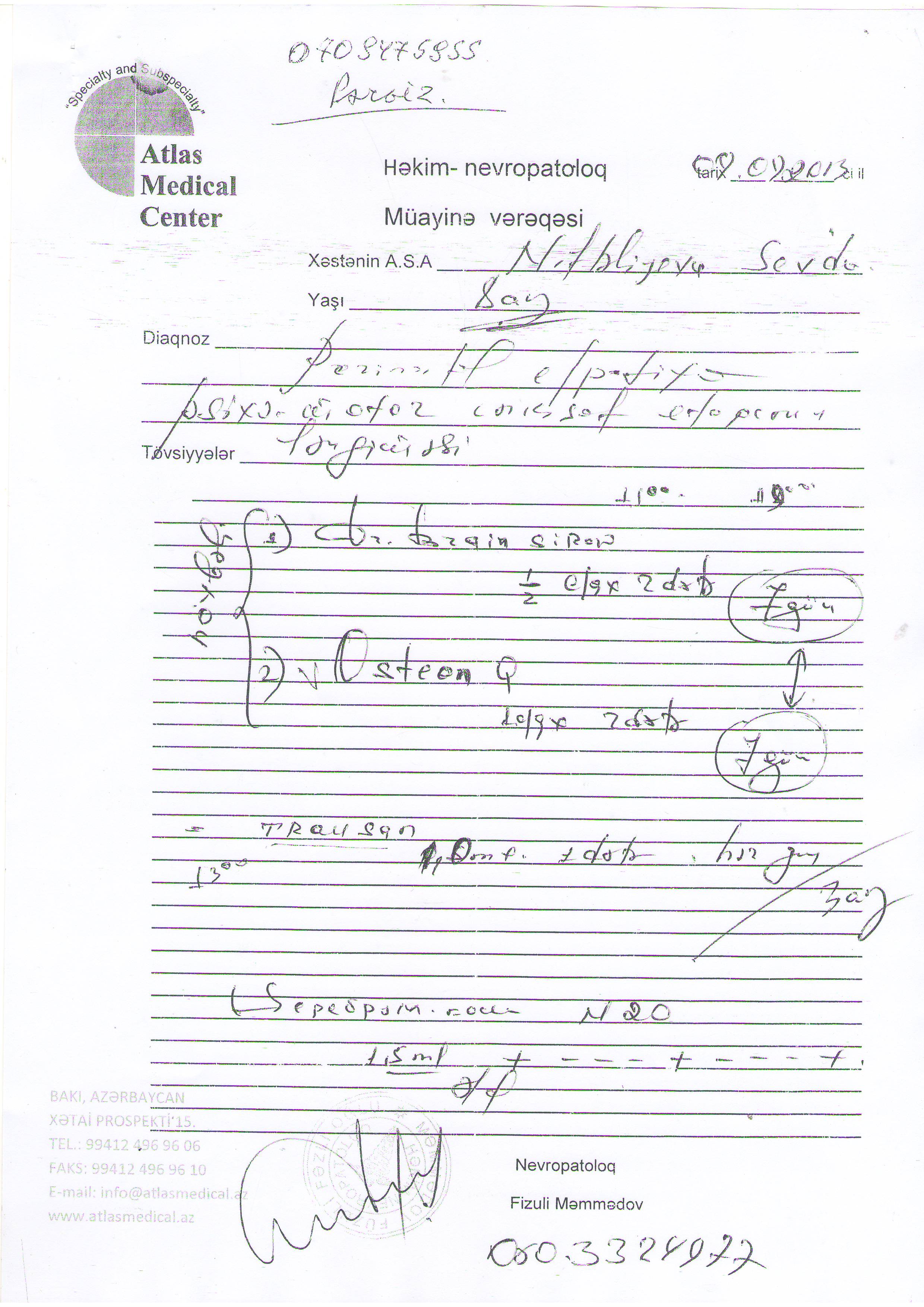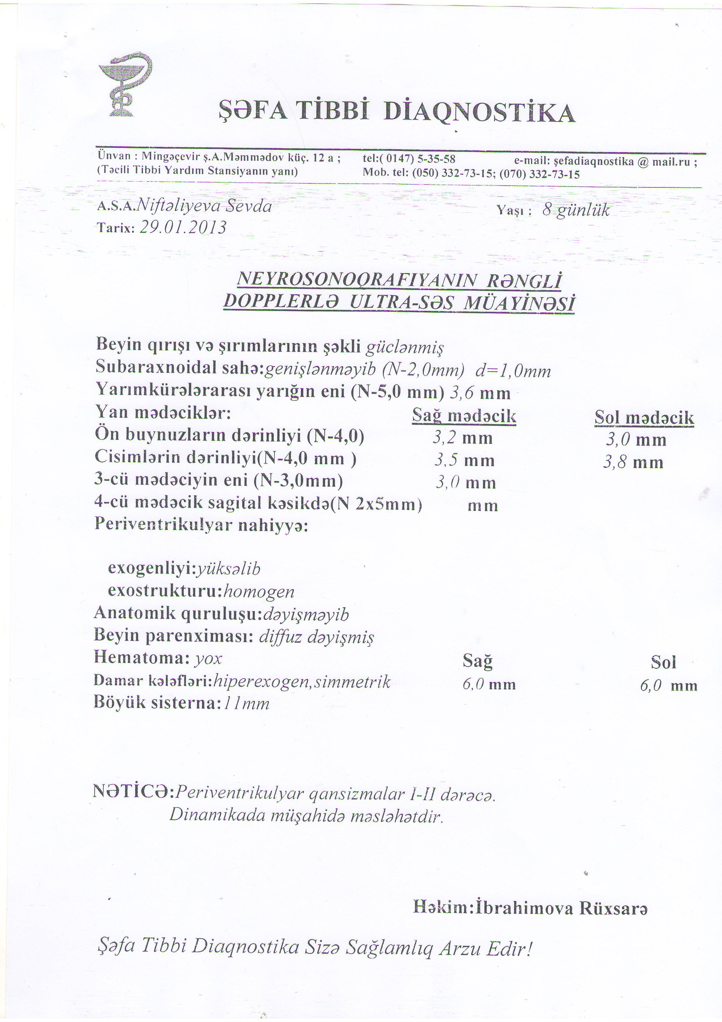 Ancaq sonradan Bakı şəhərində savadlı həkimlər müayinə edib bildirdilər ki, doğuş zamanı aldığı “travma” nəticəsində uşağın beynində qansızma var. Ağdaş rayonu Ləki qəsəbə Xəstəxanasının həkimi Fəridə Osmanovanın savadsızlığı və səriştəsizliyi nəticəsində iki ildir azyaşlı qızım Sevdanı Bakı şəhərində yerləşən Xəstəxanalarda və Rusiyada yerləşən Xəstəxanada müalicə etdirirəm.