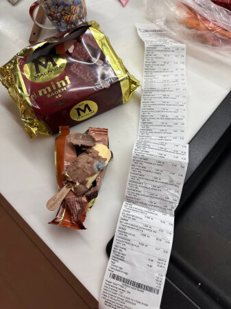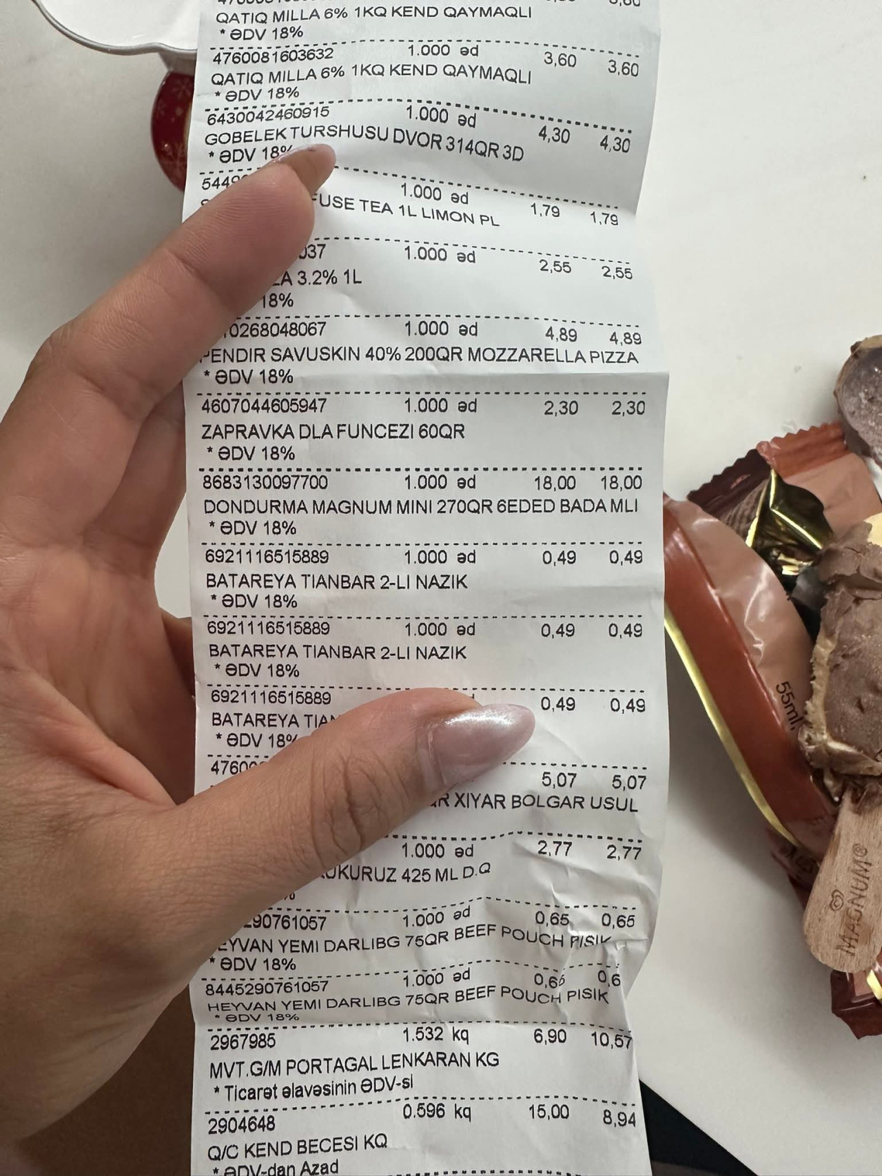 18 AZN ödəyərək aldığı dondurmanın yararsız vəziyyətdə çıxmasından ciddi narazılığını bildirən vətəndaş, məsələni sübut etmək üçün həm kifli məhsulun, həm də alış-verişi təsdiqləyən çekin fotoşəkillərini təqdim edib.