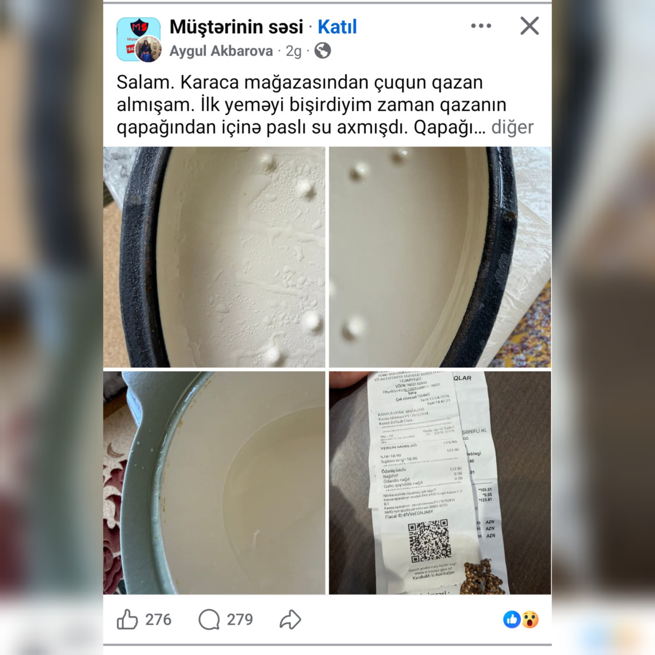 32gun.az yazır ki, yemək bişirən zaman qazanın qapağından içəriyə doğru paslı su axdığını müşahidə edən müştəri, qapağın kənarlarında açıq-aşkar paslanma olduğunu görüb və bu pas izlərinin qazanın ağız hissəsinə də keçdiyini bildirib. Problemi sənədləşdirərək mağazaya müraciət edən vətəndaş, məsələnin araşdırılmasını tələb edib. Lakin mağazadan 4 gün sonra gələn cavab şok effekti yaradıb: şirkət nümayəndələri məhsulda heç bir qüsur olmadığını, problemin istehlakçı tərəfindən qazanın quru saxlanılmaması səbəbindən yarandığını iddia edərək şikayəti rədd ediblər. Müştəri isə çuqun qazanda yemək bişirilərkən yaranan təbii buxar və nəmin qarşısını almağın qeyri-mümkün olduğunu vurğulayaraq, şirkətin bu yanaşmasını bəhanə və müştərini yola vermək cəhdi kimi qiymətləndirib. Aygül Əkbərova "Karaca Azərbaycan" kimi böyük bir brendin belə ucuz üsullarla öz adını gözdən salmasına etiraz edərək, məsələyə yenidən baxılmasını tələb edir.